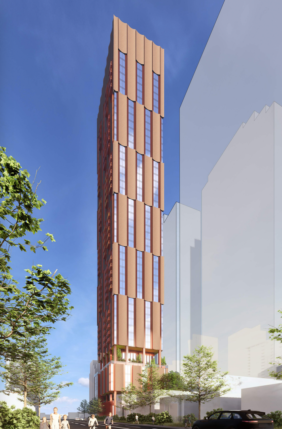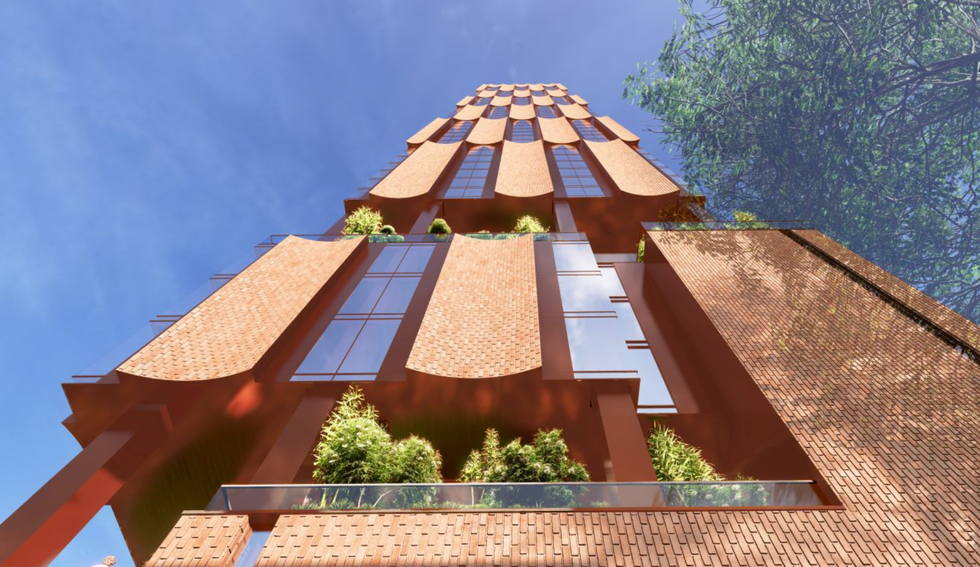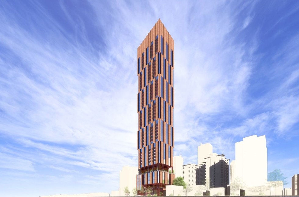 The three one- to two-storey single-detached homes that currently occupy the site would be demolished and in their place would rise the 49-storey building comprised of a five-storey podium and 44-storey tower element. DIALOG has been retained by the developers to design the building and renderings from the firm depict a unique orange brick cladding with concave elements that run along the tower's exterior.