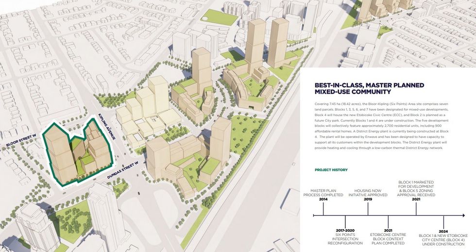 Located at the 'Six Points' in Etobicoke, the site is part of the larger Bloor-Kipling master-planned community, which contains seven development blocks and will deliver over 2,700 residential units, including over 900 affordable units, two public parks, and 88,264 sq. ft of retail and commercial space, once complete. As of now, under-construction elements of the master-planned community include Block 1, which consists of a purpose-built rental development, and Block 4, which will house a new Etobicoke Civic Centre and a District Energy plant.