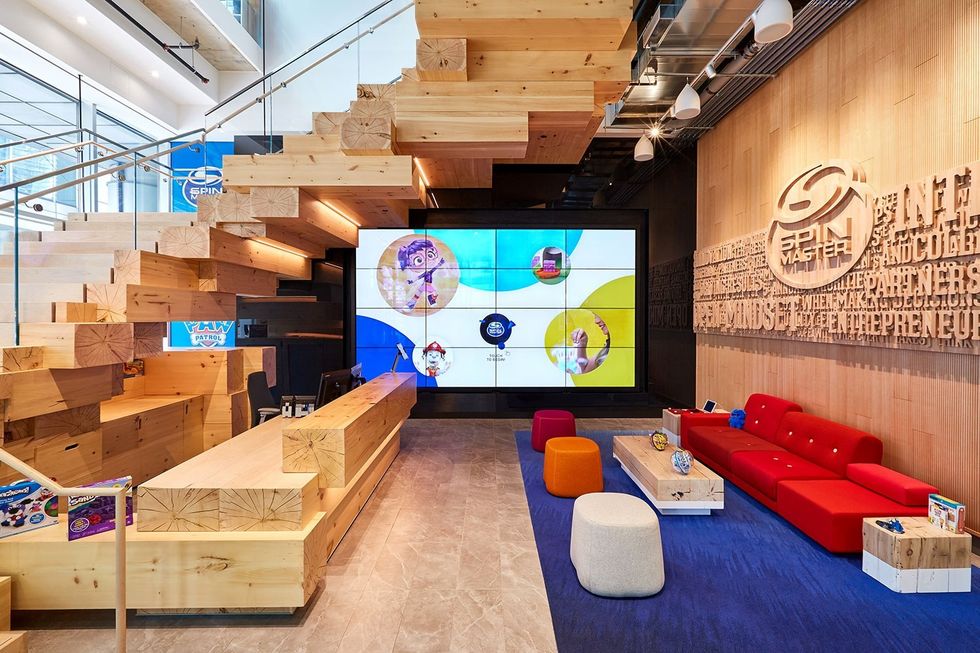 Doors Open Description: "Located inside Metro Hall, Spin Master boasts a colourful and welcoming reception area, anchored by a video wall that introduces you to this children's entertainment company — showcasing some of its hits, from PAW Patrol to Unicorn Academy. Visitors can explore artifacts, get their hands in “kinetic sand” and visit the Playground Café with a mural that features the word "PLAY."
