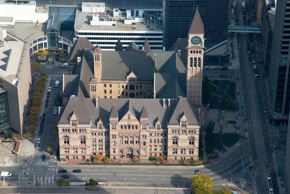 Doors Open Description: "The imposing Old City Hall was Toronto’s third city hall. The lobby features one of the city's few secular stained-glass windows. Original gargoyles were replaced in 2002 with replicas. And, in 1925, a cenotaph was erected outside to honour Torontonians who died in the First World War (later updated for veterans of the Second World War and the Korean War)."