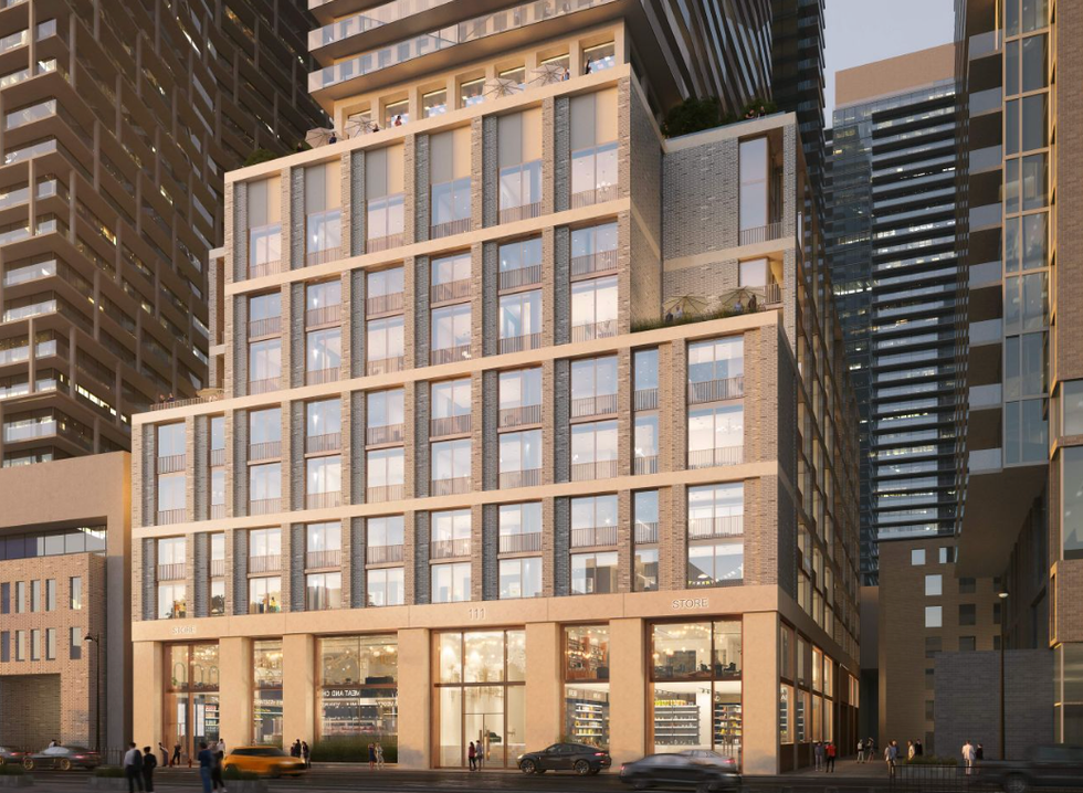 Designed by WZMH Architects, the building would utilize pre-cast brick panel to ensure the structure meshes well with the surrounding heritage buildings. Renderings depict a sleek building with brick and concrete featured on the lower levels and an eye-catching glass crosshatch pattern across the tower element.
