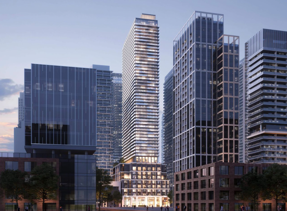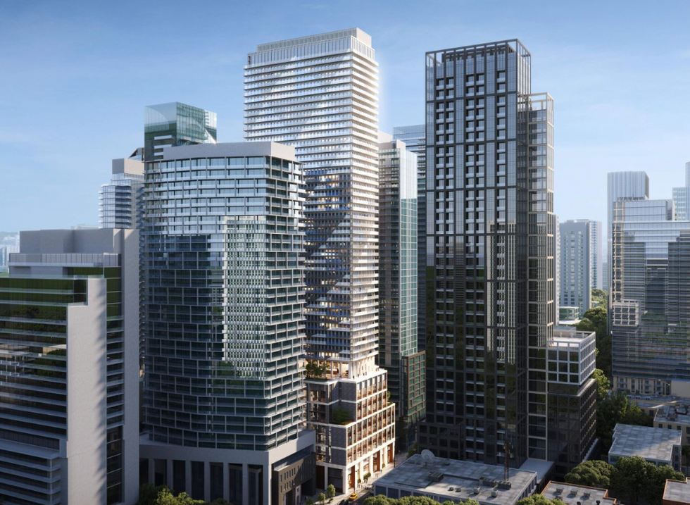 Plans have recently been proposed for the redevelopment of a nine-storey office building in Toronto's Entertainment District. The proposal, filed by Capital Developments in partnership with iA Financial Group, envisions a 43-storey addition atop the existing building totalling 52 storeys and delivering 852 residential units with retail at grade.