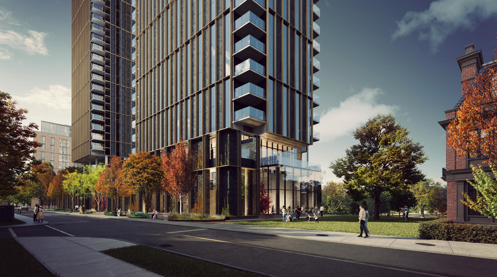 A chic new infill development has been proposed for Toronto's Yonge—St. Clair neighbourhood that would rise 38 and 43 storeys and provide over 700 new residential units and a new public park.