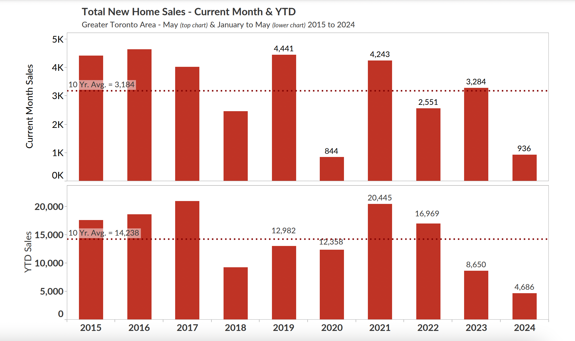 The numbers came in at a meagre 936 new home sales in May, down 71% from last May and 71% below the ten year average, according to data from Atlas Group. Of the 936 sales, 539 were condominium apartments, down 75% from May 2023 and 75% below the 10-year average; 397 were single-family homes, down 65% from May 2023 and 61% below the ten-year average.