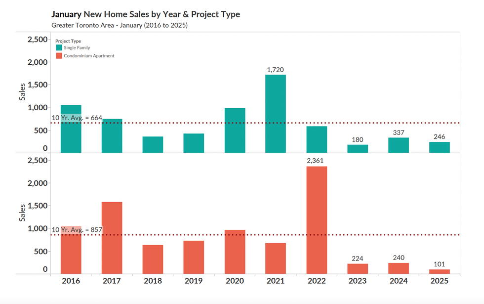 Of the 347 new homes sold in January, the majority were single-family homes at 246 sales, and condominium apartments brought up the rear with 101 units sold, down a staggering 58% from January 2024 and 88% below the 10-year average.