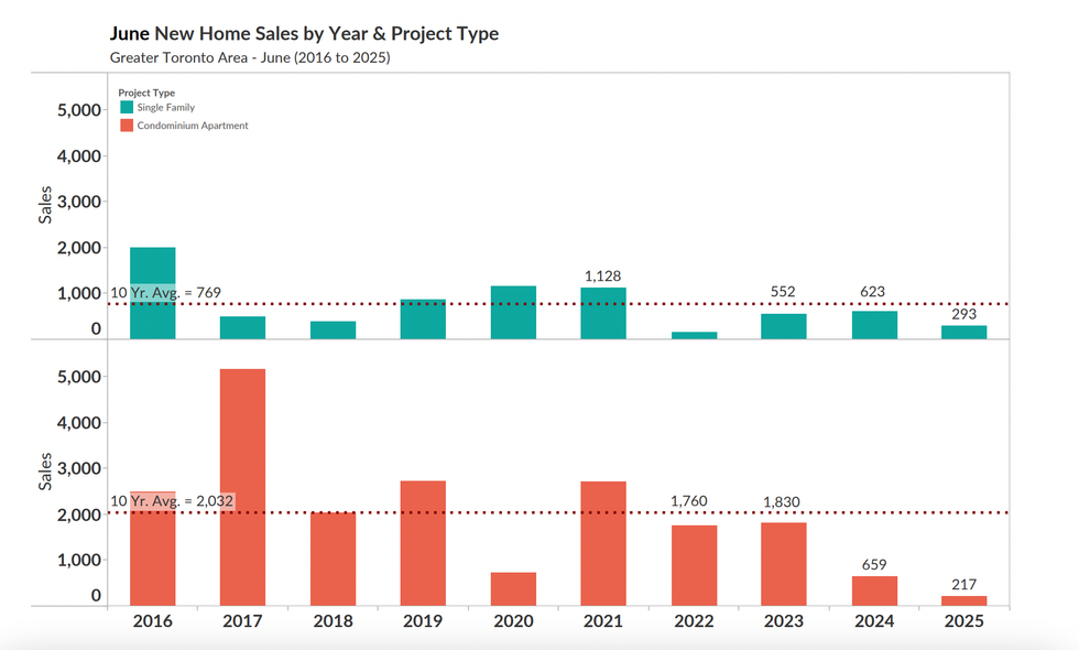 Of the 510 sales recorded in June, 217 were condominium apartments, down 67% from June 2024 and 89% below the 10-year average, while 293 were single-family home sales, down 53% year over year and 62% below the 10-year average.