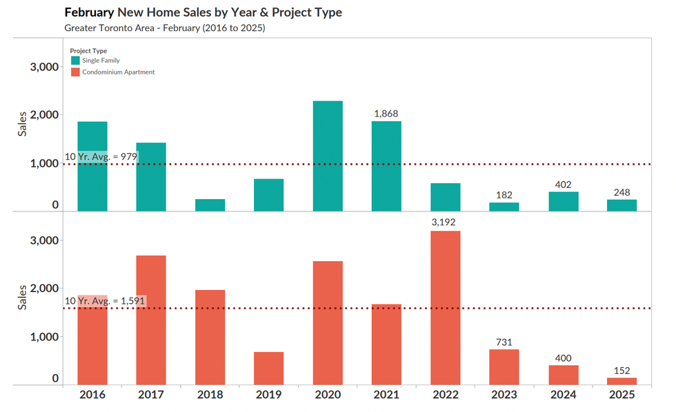 Of the 400 new homes that did sell, 248 were single-family homes, down 38% from February 2024 and 75% below the 10-year average, and 152 were condominiums, down 62% from February 2024 and 90% below the 10-year average.