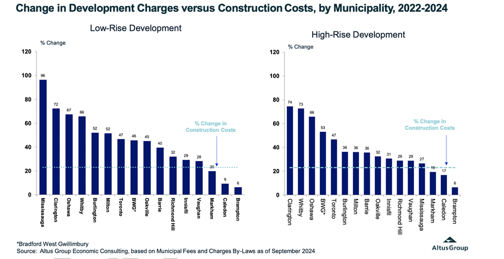 These fees are largely made up of development charges, parkland dedication, and community benefit charges, but development charges take the cake. In 2022, development charges used to increase by a rate of 6%, but by 2024, the growth rate had increased to 74%, greatly outstripping the cost of building infrastructure. This increase, paired with other fees, taxes, and charges from all levels of government has led to fees amounting to around 25% of the cost a new homebuyer might pay for a house.