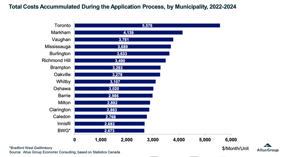According to the study, leading the region in lowest fees, approval times, and least improvements needed on planning features, among 16 municipalities, were Barrie, Oakville, and Mississauga and among the highest were Caledon, Oshawa, and Richmond Hill.