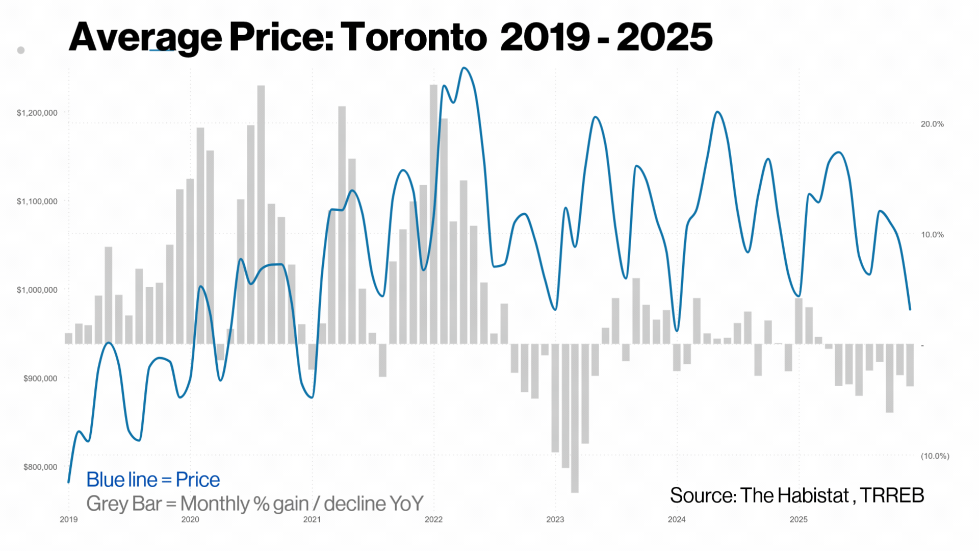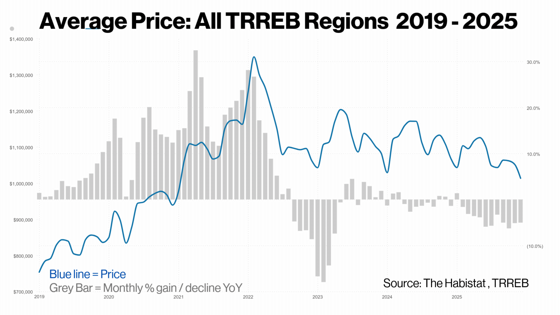 The broader TRREB area, which includes Durham, Halton, Peel, and York regions, shows a clear declining trend since the 2022 peak. One market held while the other declined, yet both get averaged together into a single "GTA average price" that obscures this divergence entirely.