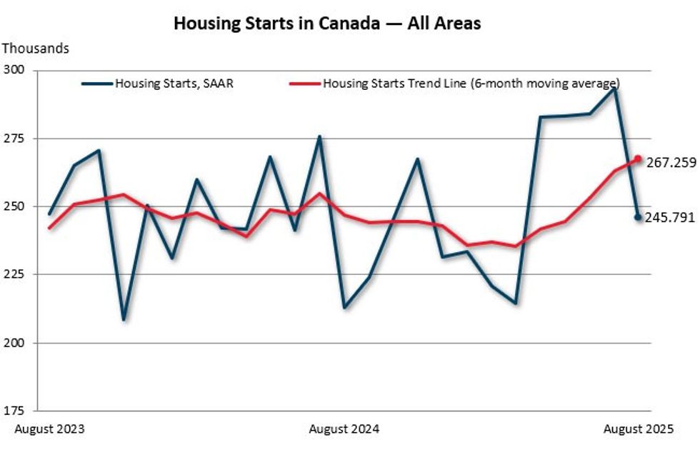 August represented one of the weaker months this year for housing starts, according to the latest data from the Canada Mortgage and Housing Corporation (CMHC). At the national level, the total monthly seasonally adjusted annual rate (SAAR) of starts fell 16% last month, compared to a 4% increase in July.