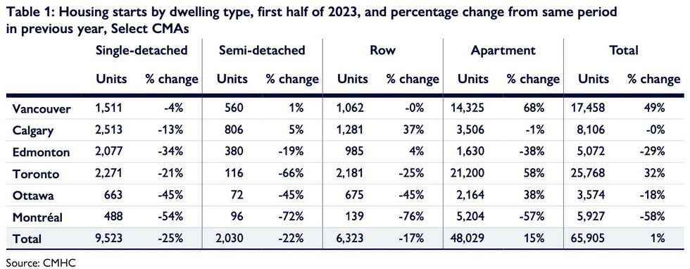 High interest rates are to blame for the "generalized weakness" in starts for single-detached, semi-detached, and row houses, as prospective buyers shy away from the pricey property types. This demand has instead been refocused on apartments, driving up starts in Toronto and Vancouver’s expensive real estate markets.