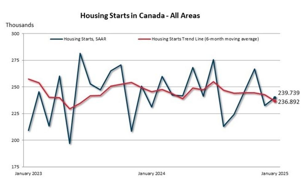 Canada Mortgage and Housing Corporation (CMHC) released its first housing starts report of 2025 on Monday, and while the data shows a 3% pick-up in the annual rate of starts between December and January, any optimism for the rest of year is tempered by trade uncertainty as experts warn of the likely drag on housing construction.