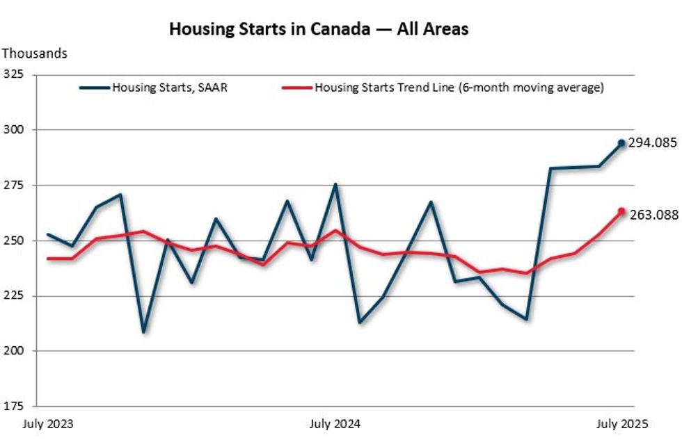 Taking a closer look at July's growth, actual year-over-year housing starts were up 4% from 22,610 units in July 2024 to 23,464 units last month, and year-to-date, starts were also up 4% at 137,875 units. Zooming out, the six-month trend in housing starts, which is a six-month moving average of SAAR of total starts, increased 3.7% to 263,088 units in July.