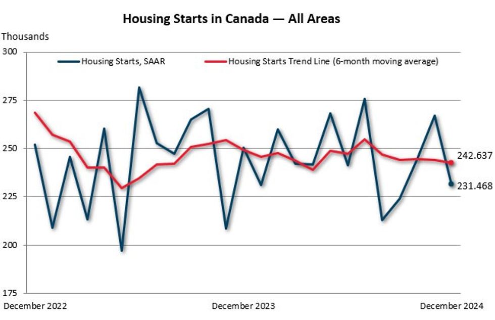 Month over month, multi-unit urban starts dropped by 15% from 195,281 units to 168,515 units, while single-detached urban starts decreased 10% from 49,802 units to 45,485 units in December. In rural areas, there were 17,468 SAAR housing starts, up from 17,360 units in November.