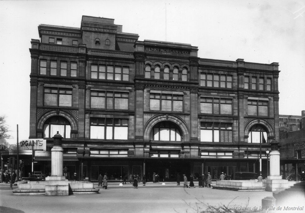 Constructed in phases, the first building was a four-storey neo-Romanesque structure designed by John Peace Hill in 1891. The facade features red sandstone, imported from Henry Morgan’s homeland of Scotland. Its top floor served as a factory for its custom goods division, which set it apart from competitors. In 1923, an eight-level addition was added with large windows and walnut fixtures. A modern brutalist structure was added in 1964 along Boulevard de Maisonneuve.