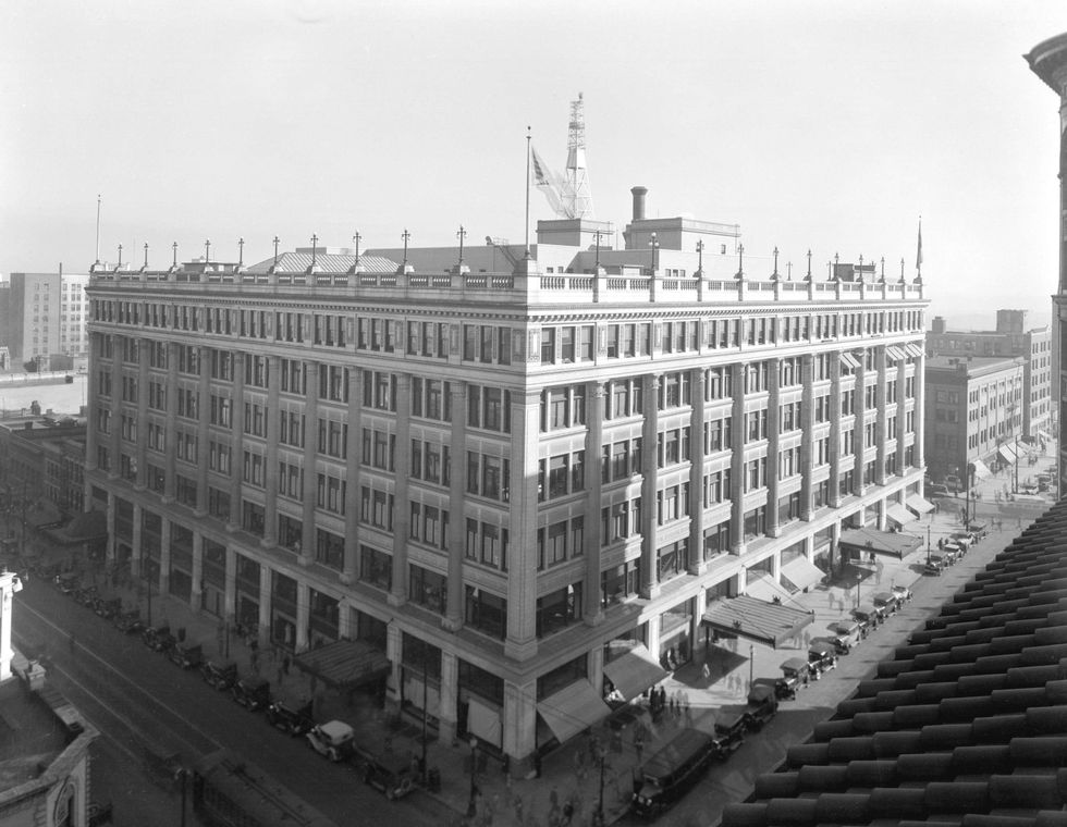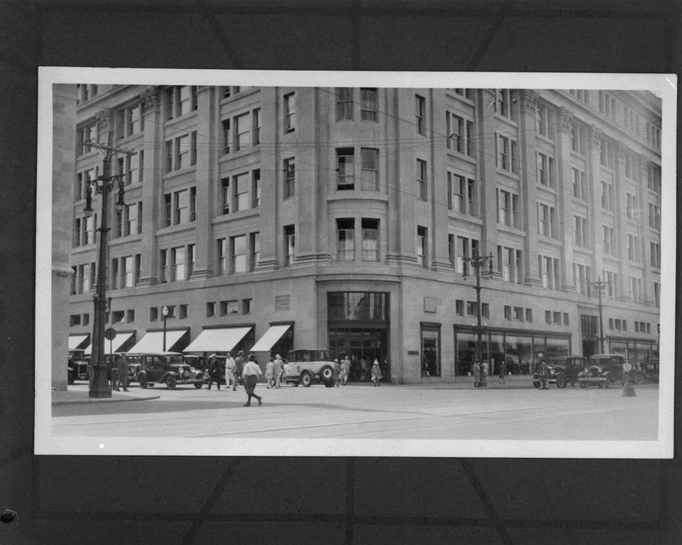 The Georgian style Burke, Horwood and White store took almost a decade to construct. Breaking ground in 1913, both the economic downturn and World War caused delays. When it opened in 1921, it had 50 departments and was seen as a symbol of modernism with ventilation systems and elevators. Descriptions note mahogany and brass fixtures outfitting the space and a library for customers to recharge.