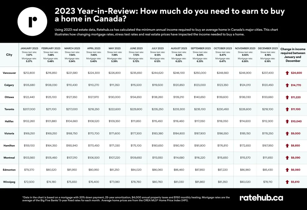 “This was a terrible year for home affordability in Canada; mortgage rates went up, driving the stress test higher and homes were more expensive in seven out of 10 cities,” says James Laird, Co-CEO of Ratehub.ca and President of CanWise mortgage lender. “The income required to purchase a home increased significantly in all 10 cities. The income required ranged from an extra $5,610 in Winnipeg all the way up to an additional $24,600 in Vancouver.”