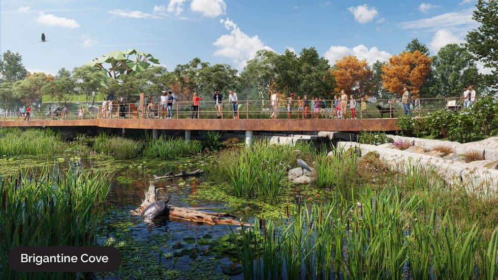 Indigenous culture flows through the designs, sometimes manifesting in more overt features like the 3,400-sq.-ft Indigenous Cultural Pavilion in Brigantine Cove, but also in more subtle ways, such as the park's four-directional layout along north, south, east, and west axes, as well as an overall focus on restoring and protecting the natural environment and biodiversity.