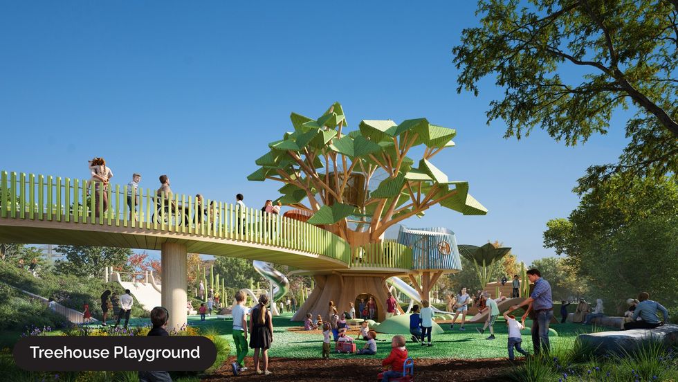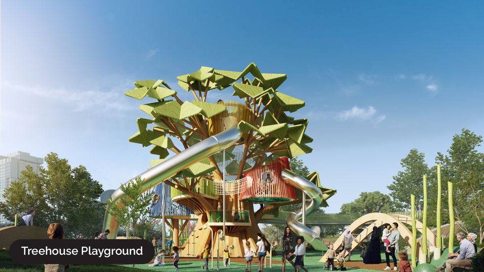 The designs include several spaces for visitors to discover, such as a canoe launch at Brigantine Cove, woodland trails and a Trillium-shaped fountain in the Forum, or a large sand beach on the Mainland, but arguably the most eye-catching renderings released are of the massive treehouse and turtle play structures located in Brigantine Cove.
