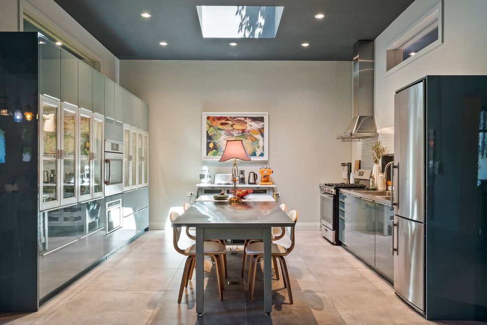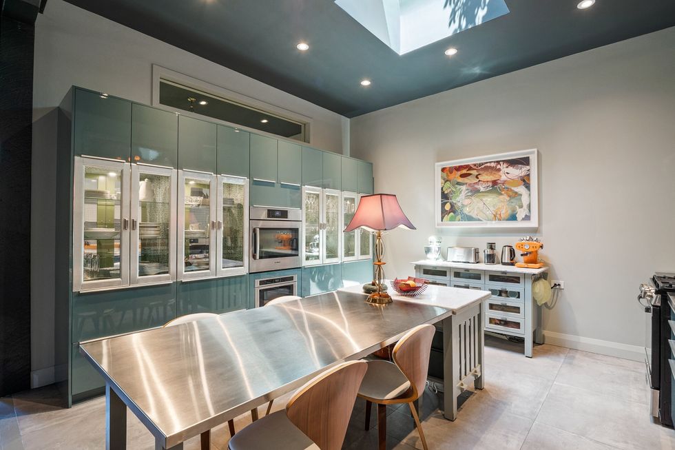 The coolness continues in the kitchen, where jade-coloured high-lacquer cabinetry glows under a large skylight. Meanwhile, a stainless steel kitchen island gives the space some industrial charm. Making for easy and enjoyable meal prep, this space boasts a built-in microwave, oven, and display cabinets.