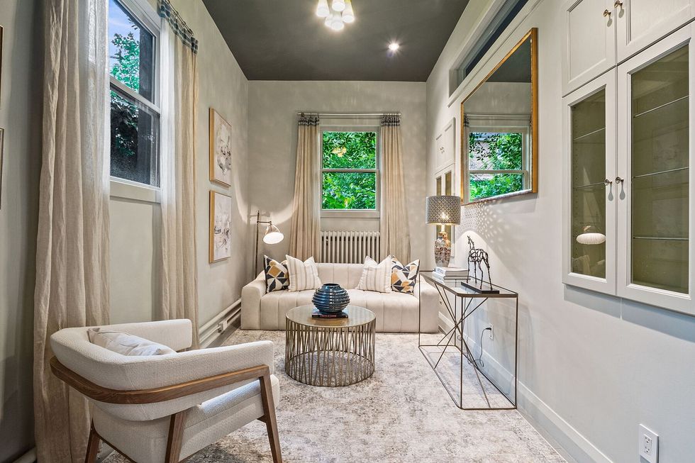 Set back from the street and surrounded by greenery, the restored loft-style home is bursting with personality and life. It boasts soaring painted ceilings, a blend of modern and antique designs, and a flexible layout that makes it the perfect property to accommodate a wide range of living styles.