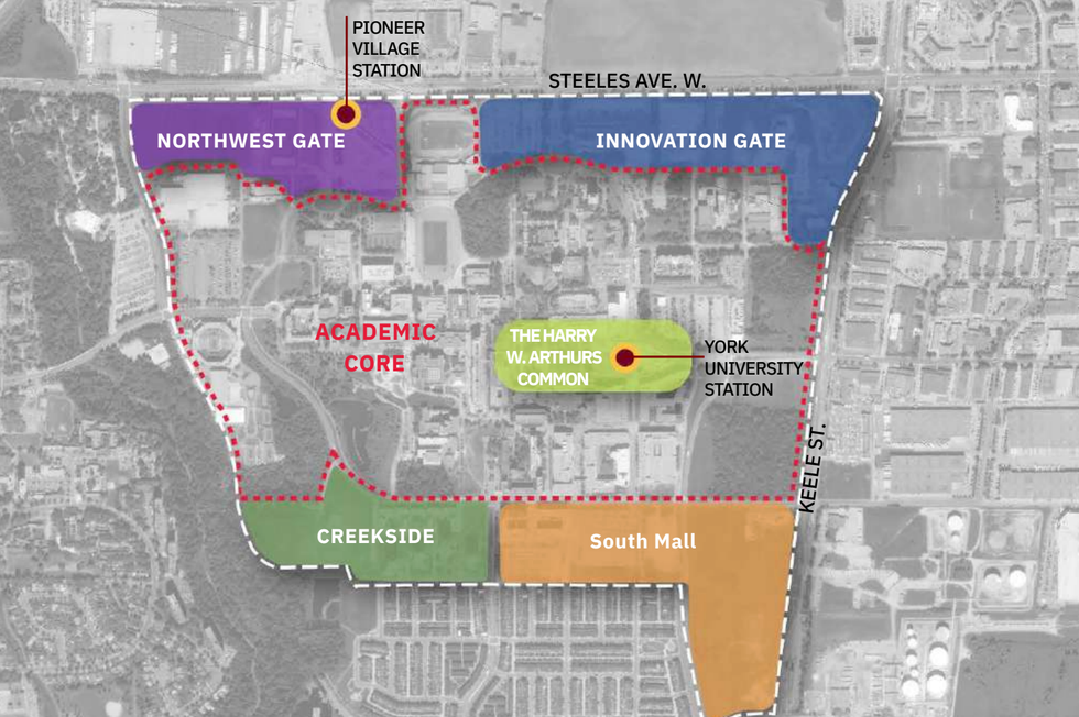 The project would be centred around Harry W. Arthurs Common, which will continue to serve as the heart of Keele Campus, and would contain four new neighbourhoods: South Mall, Creekside, Northwest Gate, and Innovation Gate.