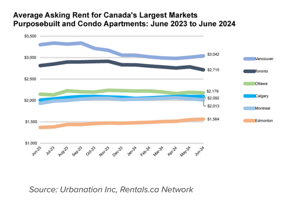 The biggest annual increases for purpose-built and condominium units were seen in Edmonton, Calgary, Montreal, and Ottawa, where rents ticked up 14.3% to $1,564, 4.2% to $2,092, 4.3% to $2,013, and 1.5% to $2,179, respectively.