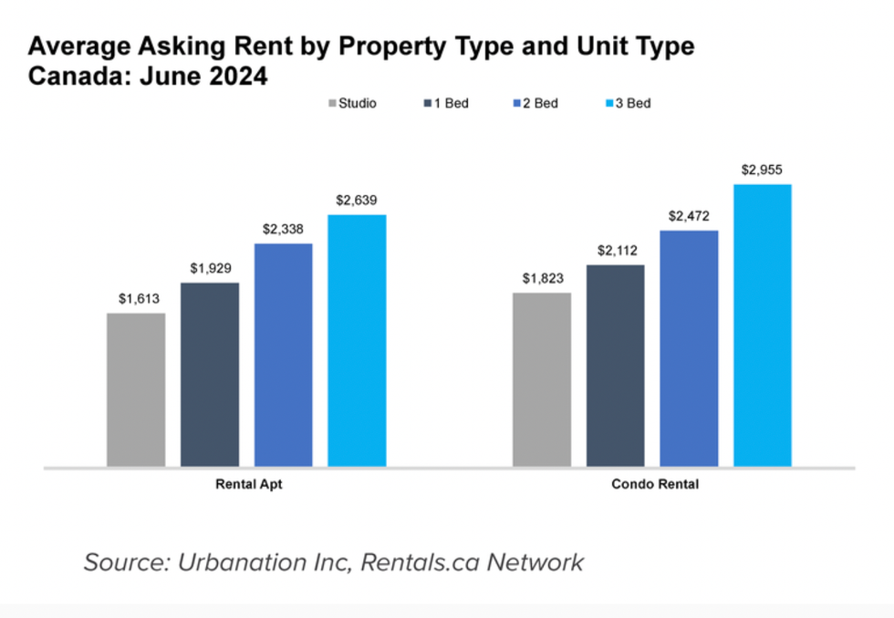 According to the June National Rent Report from Rentals.ca and Urbanation, average asking rents for all residential property types increased 7.0% from last June, landing us at $2,185 average per month. Though, on a month-over-month basis, average asking rents ticked down 0.8% from May's record-breaking $2,200 a month.
