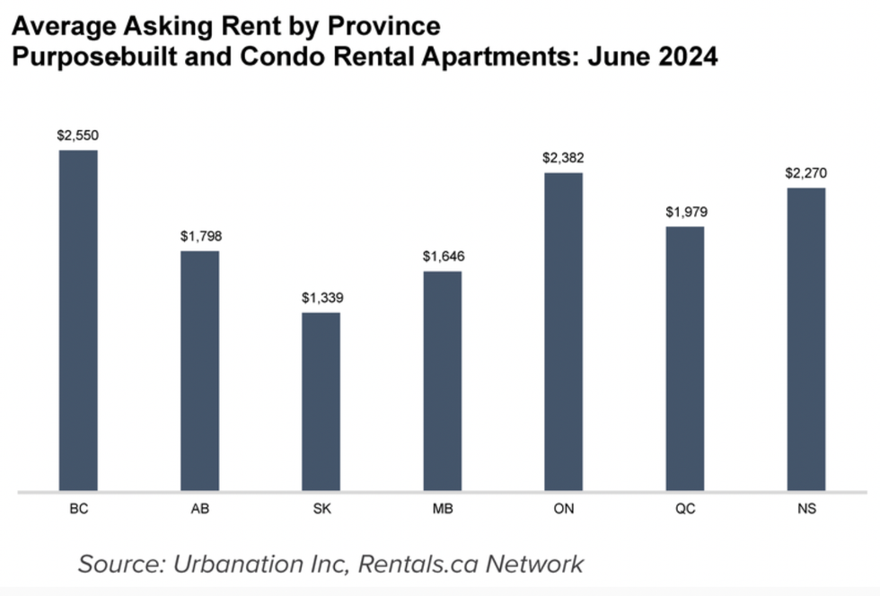 Everywhere else, average rents increased, with Saskatchewan leading the charge for the third month in a row with a 22.1% increase for purpose-built and condominium apartments. Still, the prairie province remains 38% below the national average at $1,339.