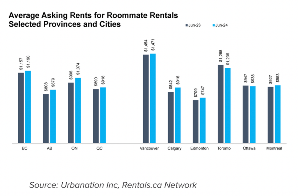 In Toronto, shared rents dropped 1.7% month over month and 4.0% annually to $1,236 this June, down from last month's $1,257, while Ottawa's roommate rent dropped 1.0% to an average of $938. In all other major cities, shared rents increased, with Vancouver taking the prize at $1,471, up 1.2% annually.
