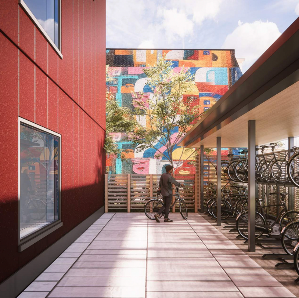 Additionally, tenants will be able to enjoy an 1,130-sq.-ft internal courtyard with trees, seating areas, and a BBQ patio, as well as a bicycle storage area with 71 long-term parking spots.