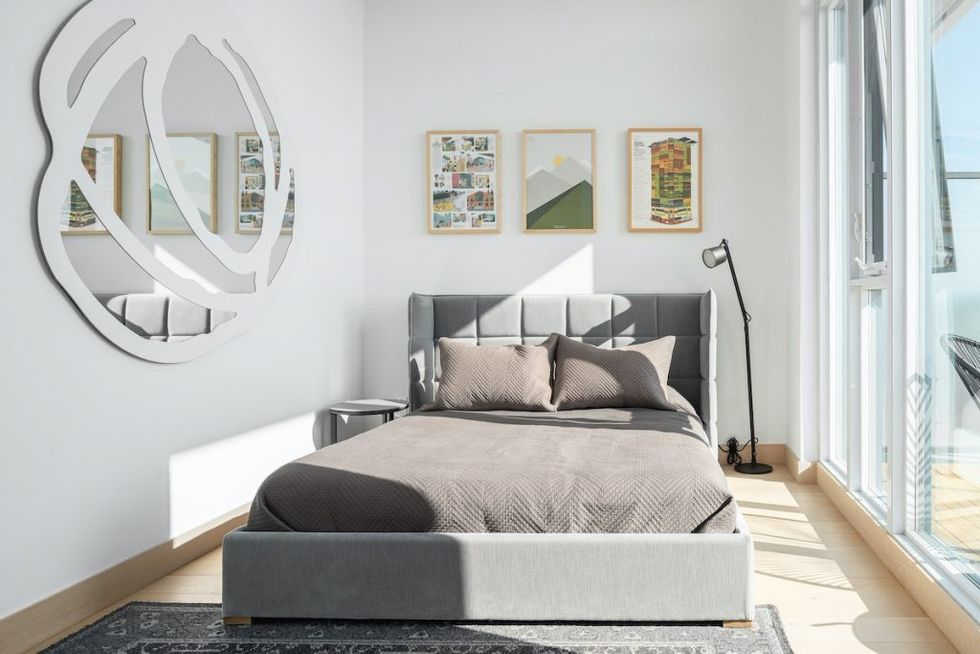 The bedroom can comfortably fit a queen-size bed and features floor to ceiling windows, which fill the room with natural sunlight.