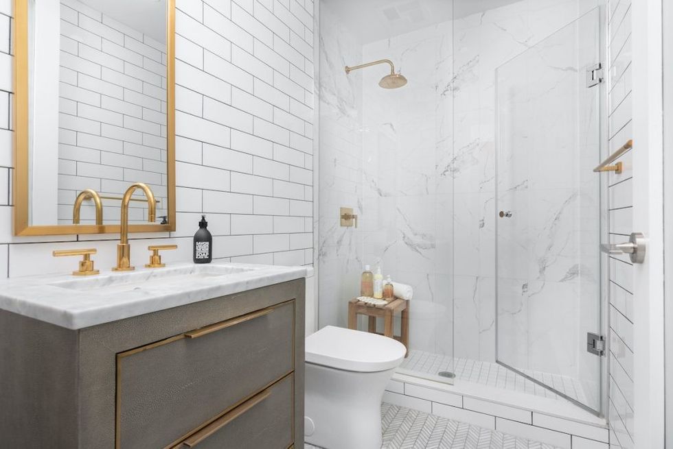Take a look at the stunning custom three-piece bathroom that has charming gold accents and a Restoration Hardware vanity for a luxe look.