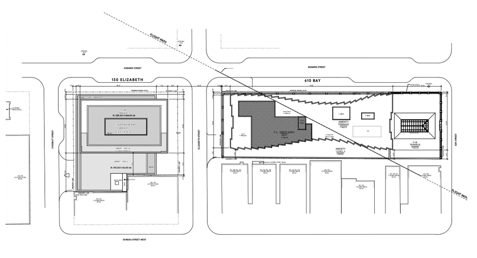 The 43-storey building 130 Elizabeth is planned to include a total of 550 units, consisting of 44 bachelors, 234 one-bedrooms, 192 two-bedrooms, 73 three-bedrooms, and seven four-bedrooms. In a similar fashion to the Bay Street building, just 14 parking spaces are proposed (for residential visitors and retail uses specifically), compared to 495 long-term bicycle spaces and 110 short-term bicycle parking spaces.