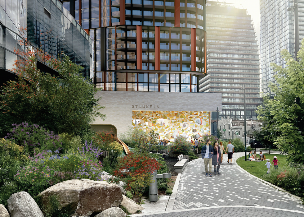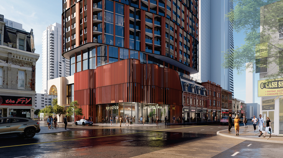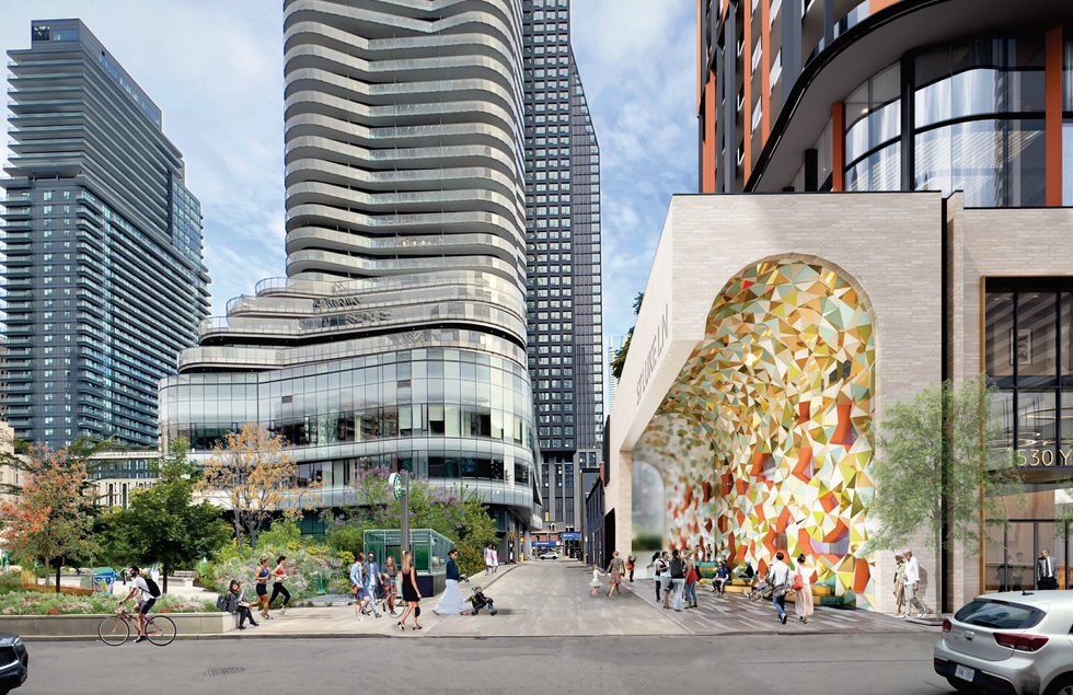 The building is being designed by Toronto-based architecture firm Giannone Petricone Associates whose renderings depict a vibrant and dynamic structure featuring eye-catching designs, especially at street level. Stand-out aspects include the privately-owned publicly accessible space (POPS), which is referred to as ‘the Porch’ and includes platform seating covered by a canopy and striking geometric wall art.