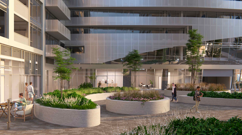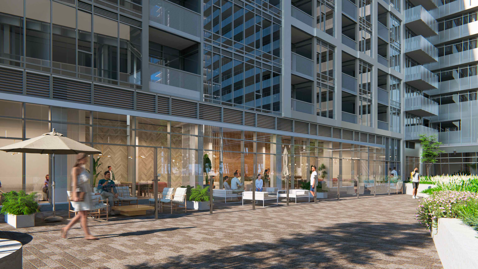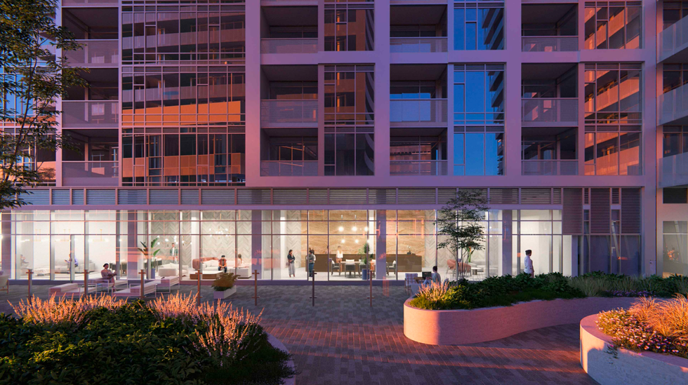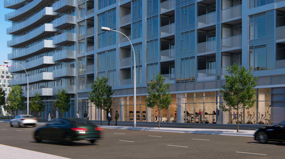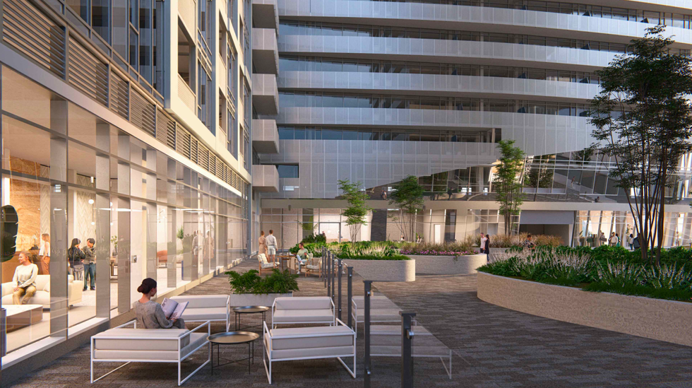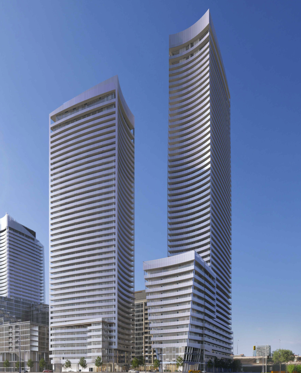 Renderings of the proposed development prepared by Hariri Pontarini Architects show three buildings, two of which appear to be conjoined with a shared podium. The glassy buildings share an ultra-modern look with stylistic curvatures and a mixture of inset and protruding balconies. An “open-space landscaped area” served by retail and restaurants is shown at the base of the proposed towers in the renderings.