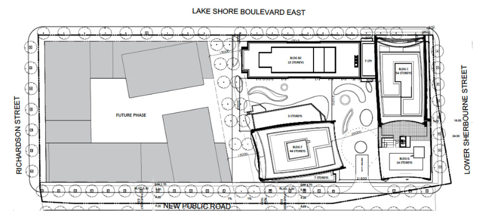 The site already has permissions in place for 49-, 39-, and 14-storey buildings, however, revised development plans along with official plan and zoning by-law amendment applications from BC-Based Pinnacle International ask for increased heights across the board, bringing the proposed storey-count up to 54, 44, and 15 storeys (rising 1,819 ft, 1,496 ft, and 538 ft respectively, exclusive of the mechanical penthouse).