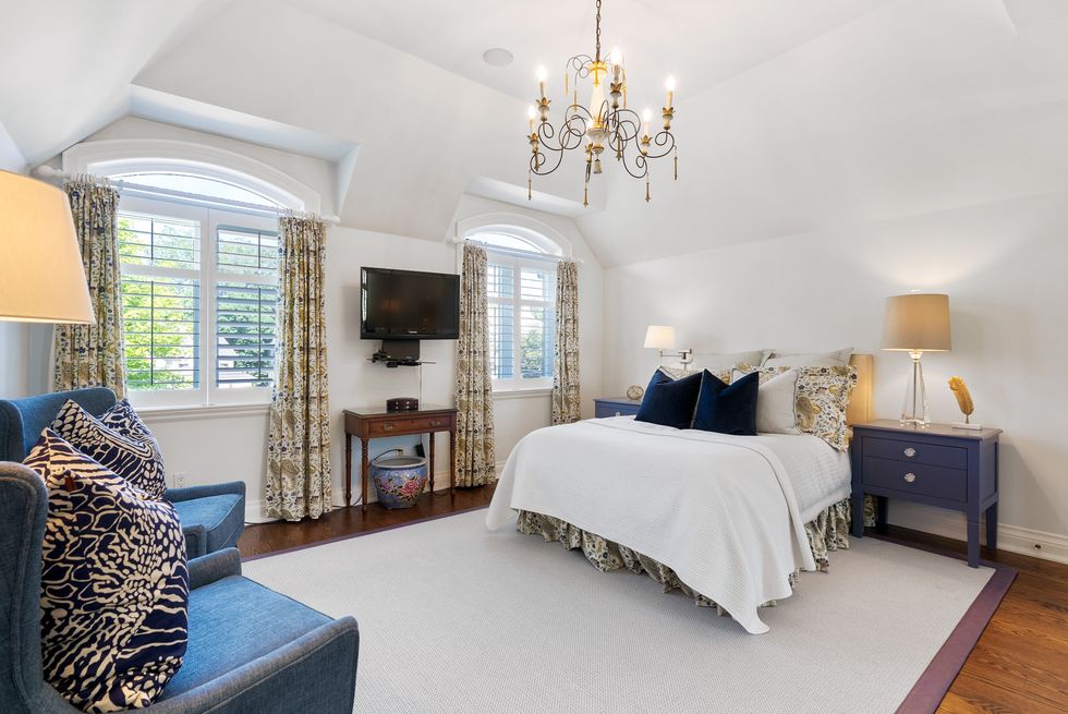 Upstairs is a primary suite fit for royalty, with a vaulted ceiling in the bedroom, double walk-in dressing rooms, and a six-piece bathroom — the highlight being a porcelain soaker tub with a mounted TV — made for those who enjoy the feeling of complete and total relaxation.