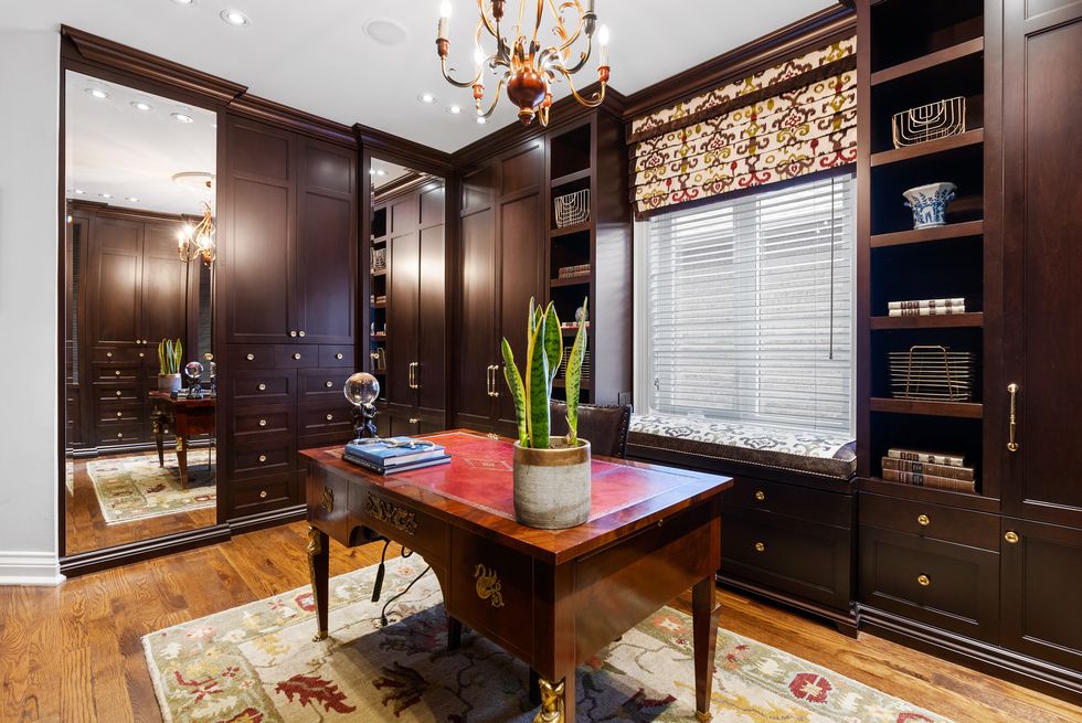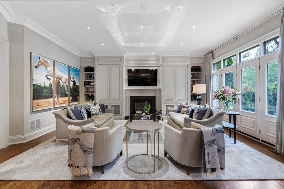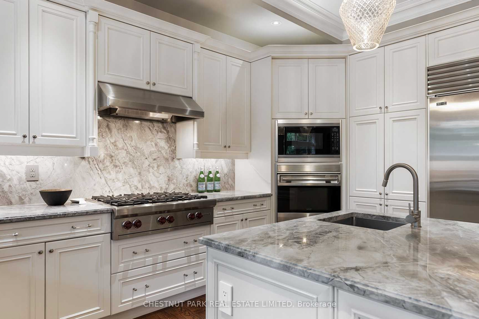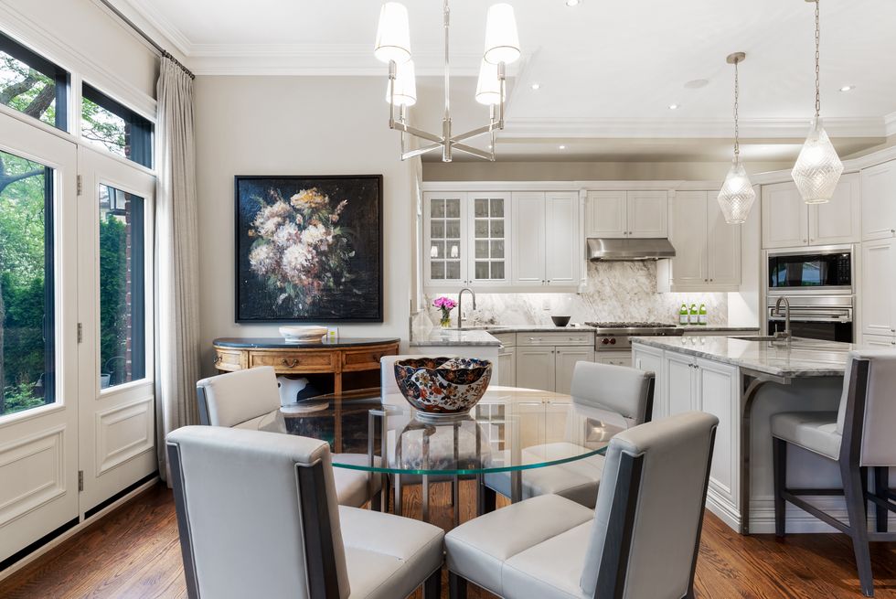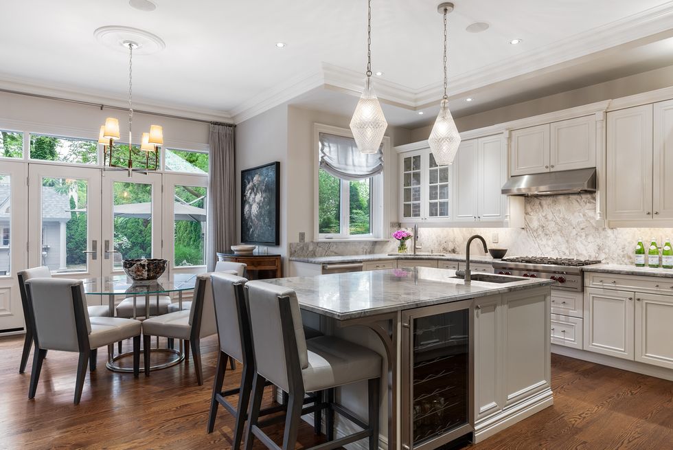 Inside, a sitting room and formal dining rooms greet you on your left, and to the right, the grand staircase. Heading towards the back of the house reveals a spacious kitchen with marble galore. In the kitchen, chef types will enjoy using top-of-the-line Wolf and Miele appliances, while guests can grab a refreshment from the built-in wine fridge.