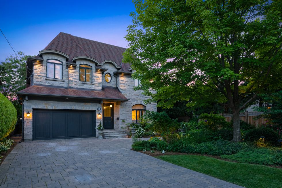 On arrival, you'll surely fawn over the front lawn’s manicured garden and mature maple tree as you make your way up the cobblestone driveway. A solid stone facade, accompanied by a steeply sloped roof and warm exterior lighting offers a preview of the elegance within.