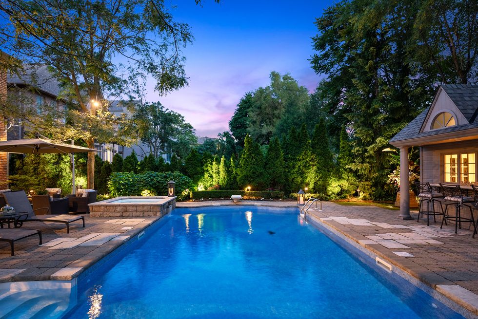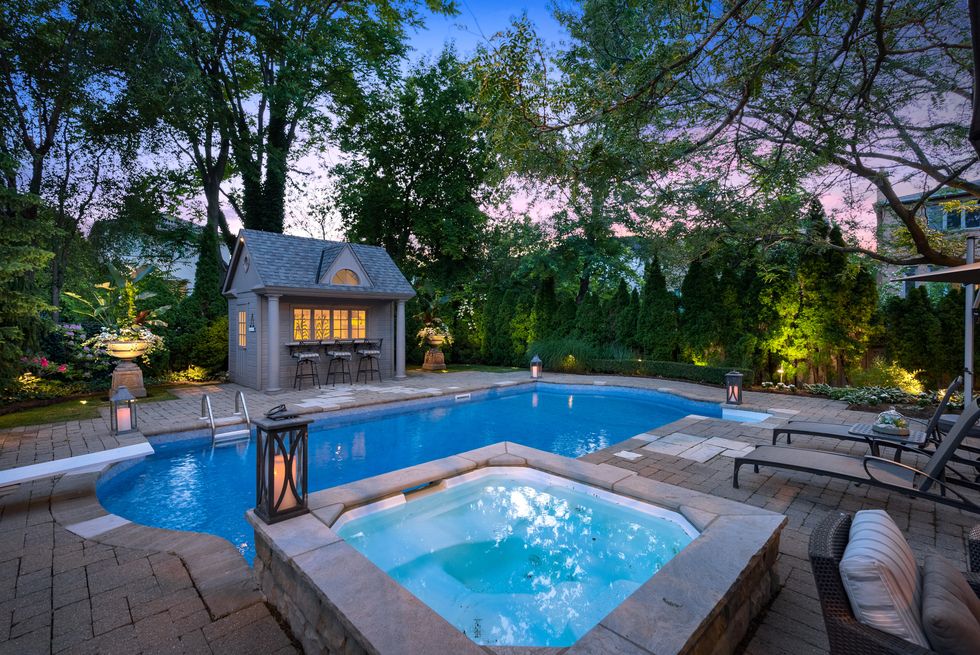 But the backyard is where the real relaxation happens. Set amongst over $200,000 worth of stunning professional landscaping is an in-ground hot tub and saltwater pool, plus a wealth of areas to lounge about. And with a cobblestone deck and ample greenery to boot, the backyard is a truly refined space.