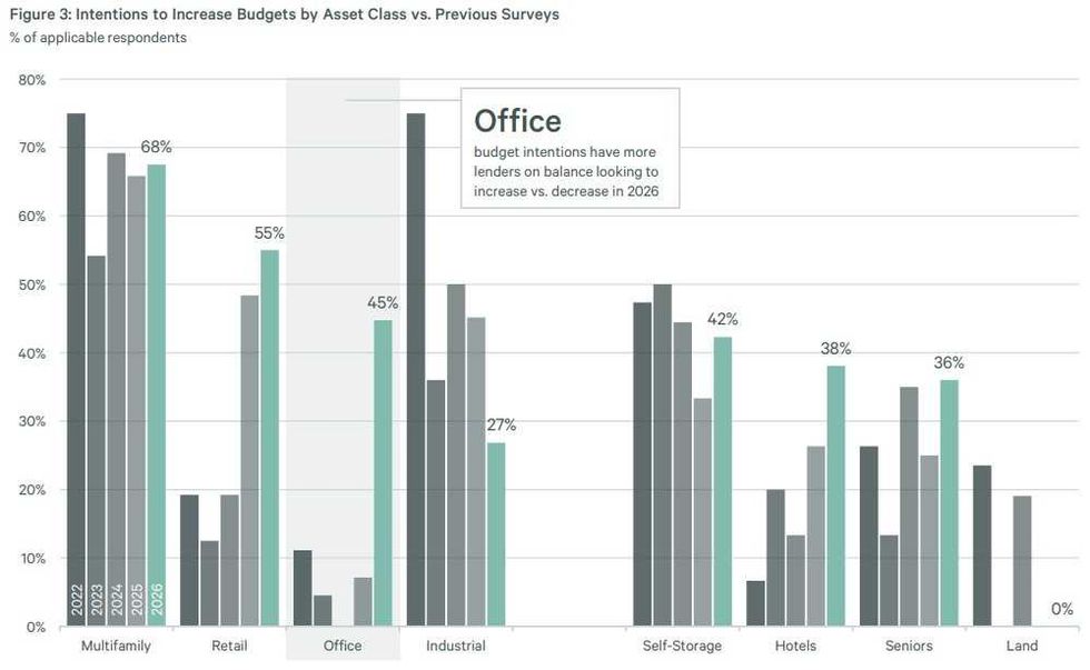 Employees are returning to the office, and lenders seem to be following suit. According to CBRE’s survey, lender intentions to increase budgets for office loans in 2026 have “surged” in 2026, a “rapid rebound in market sentiment” that represents the first rebound in six years.