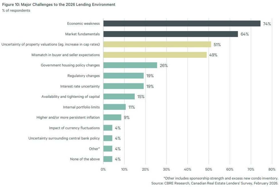 “The top two challenges to the 2026 lending environment are correlated concerns about economic weakness in Canada and how that might flow through to impact property market fundamentals,” said CBRE. “With GDP growth forecasts being revised lower for 2026, a weaker Canadian economy could drag on leasing momentum.”