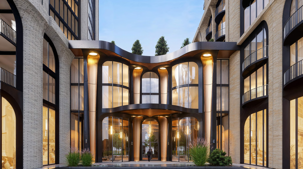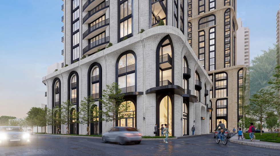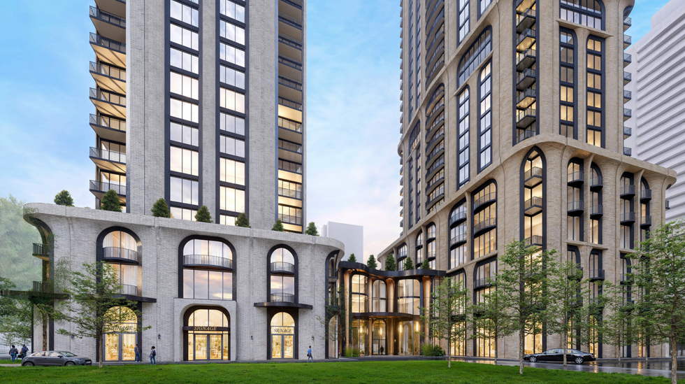 Designed by B+H Architects, the complex itself has a stunning sculpturesque form with curving arches combined with sharp verticality that gives it a contemporary Art Deco feel. Renderings also depict the use of light and dark brick, metal, and glass that give the building a luxurious look.