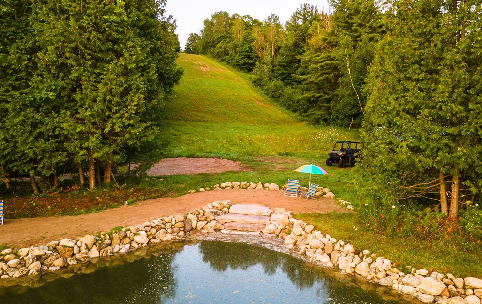 Out here, there's fun to be had year-round. Mature woods surrounding the three ski hills are home to a web of trails that could serve as cross country ski routes, bike paths, or hiking trails. And in the summer, a spring-fed pond at the heart of the property provides a crystal clear oasis for a refreshing swim, or a relaxing fishing sesh. Or, on a cold winter's day, take to the ice for a game of shinny.