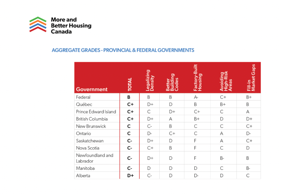 The Report Card from More and Better Housing Canada – a coalition made up of some of the biggest players in urban planning and housing – grades federal and provincial governments according to five criteria identified by the Task Force for addressing Canada’s housing affordability crisis. These include legalizing density, improving building codes, accelerating factory-built housing, avoiding building in high-risk areas, and filling in market gaps.
