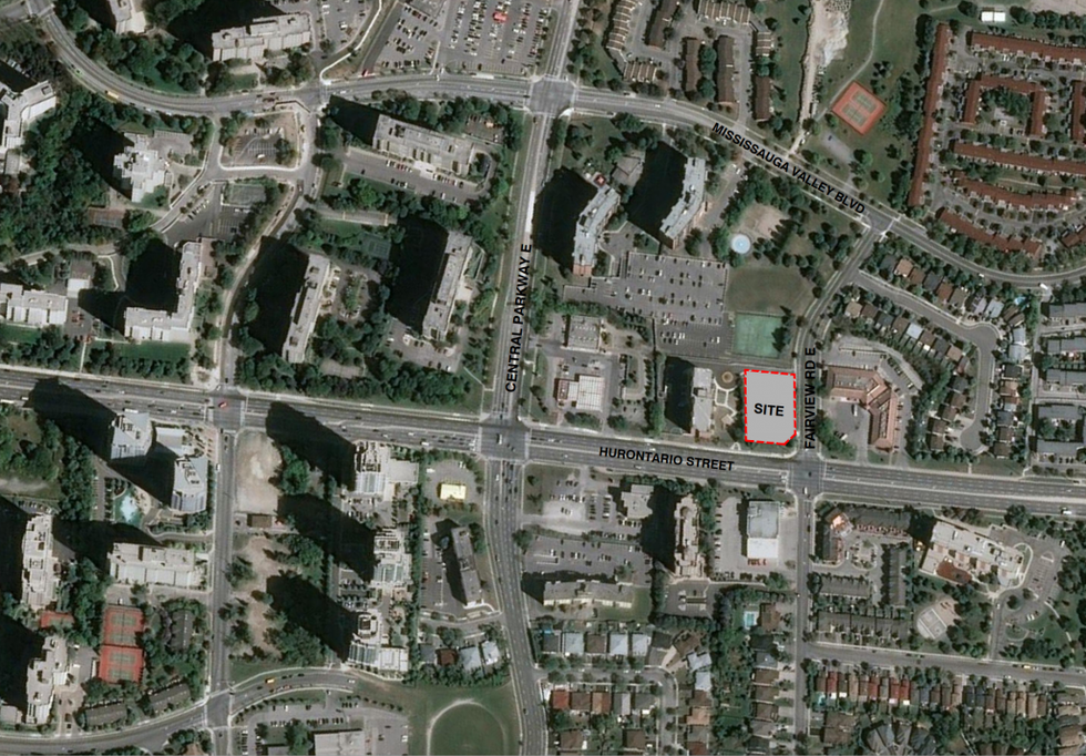 The site for the proposed building is located at the northeast corner of the intersection of Hurontario Street and Fairview Road on 1 Fairview Road East. It is within the Fairview neighbourhood and Ward 4 boundaries and is approximately 750-metres (or a 10-minute walk according to the application documents) north of the Cooksville GO Station.
