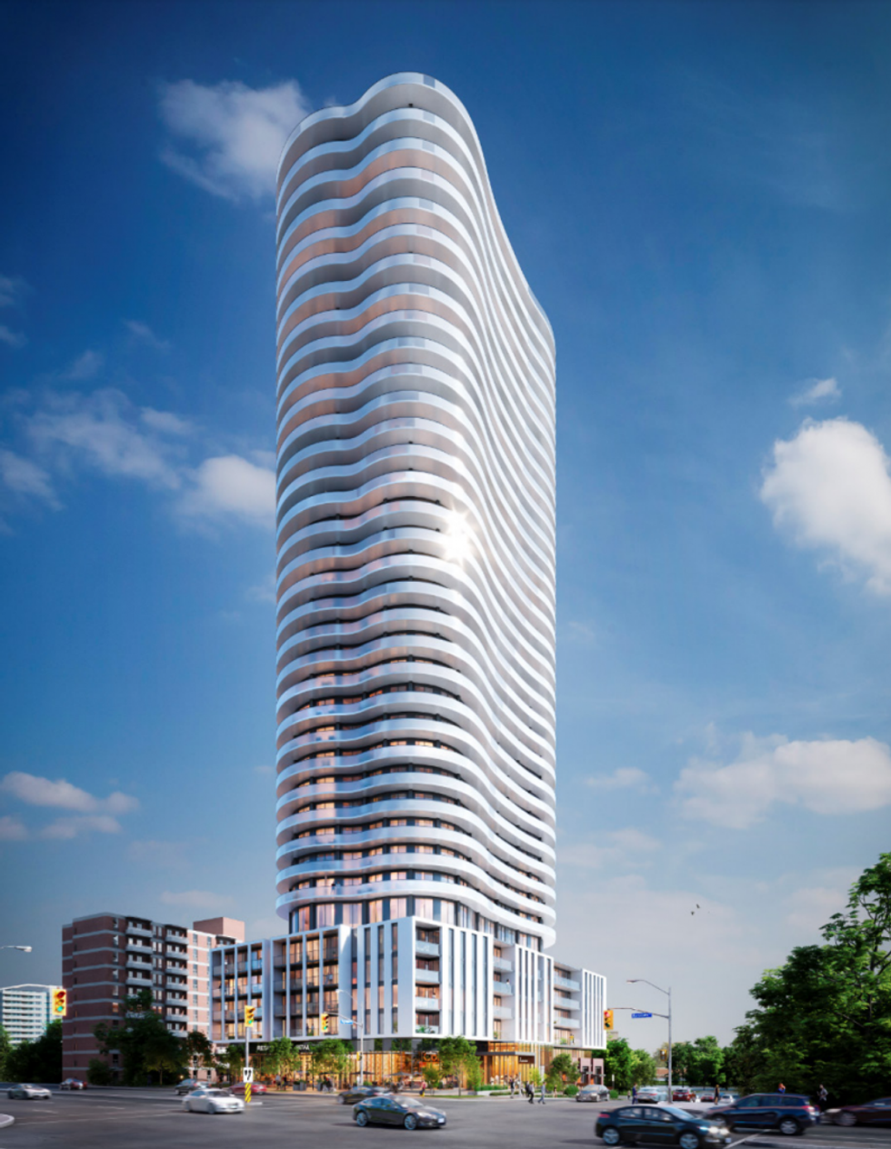 The proposed structure is as a 30-storey tower above a 6-storey podium that incorporates a 2,900-sq.ft retail space at grade level along Hurontario Street and four integrated townhouse units with direct access to the sidewalk along Fairview Road East.
