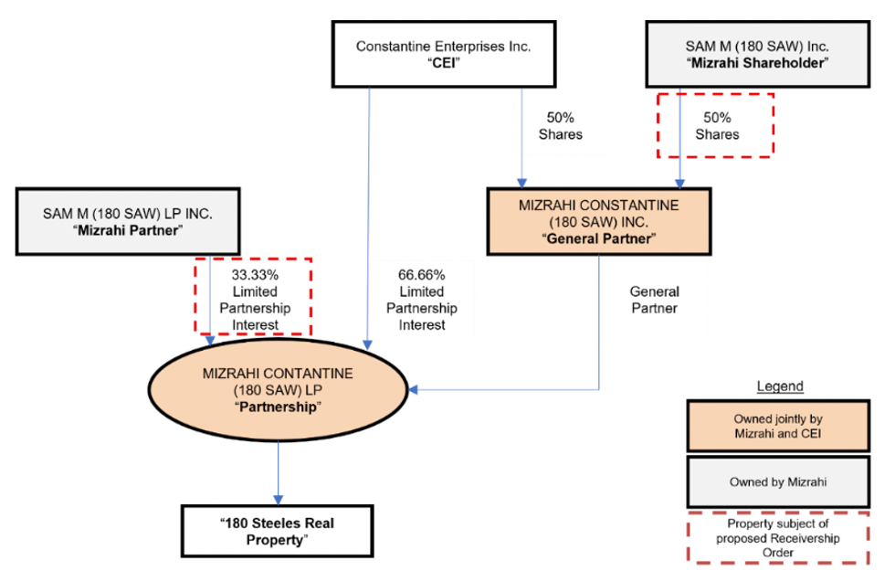 The receivership proceedings over 180 Steeles were initiated on February 23, 2024, by Toronto-based private real estate fund Constantine Enterprises Inc., who are partners on the project. This case and the earlier mentioned Hazelton Avenue case were heard together due to the fact that they involve Constantine as the applicant and Mizrahi as the principal of the respondents, and the respondents were represented by the same counsel.